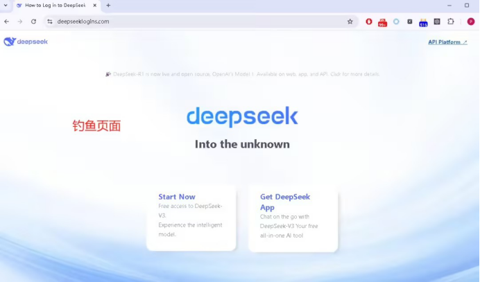 以釣魚(yú)網(wǎng)站“https://deepseeklogins.com/”為例,其頁(yè)面結(jié)構(gòu)和風(fēng)格與 DeepSeek 官方網(wǎng)站高度相似,旨在通過(guò)偽造官方頁(yè)面來(lái)誘導(dǎo)用戶泄露敏感信息。與真實(shí)網(wǎng)站相比,釣魚(yú)頁(yè)面移除了中英文切換的超鏈接。在該釣魚(yú)頁(yè)面中,點(diǎn)擊右上角的“API Platform”鏈接將會(huì)引導(dǎo)用戶跳轉(zhuǎn)到偽造的登錄頁(yè)面。