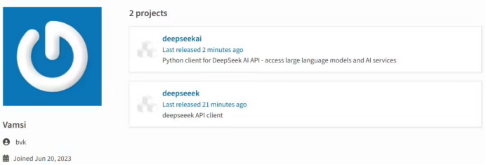 2025 年 1 月 29 日,用戶 bvk(該賬戶于 2023 年 6 月創(chuàng)建,且無(wú)其他活動(dòng)記錄)在 Python 軟件包索引(PyPI)上傳了兩個(gè)軟件包:“deepseeek”和“deepseekai”。
